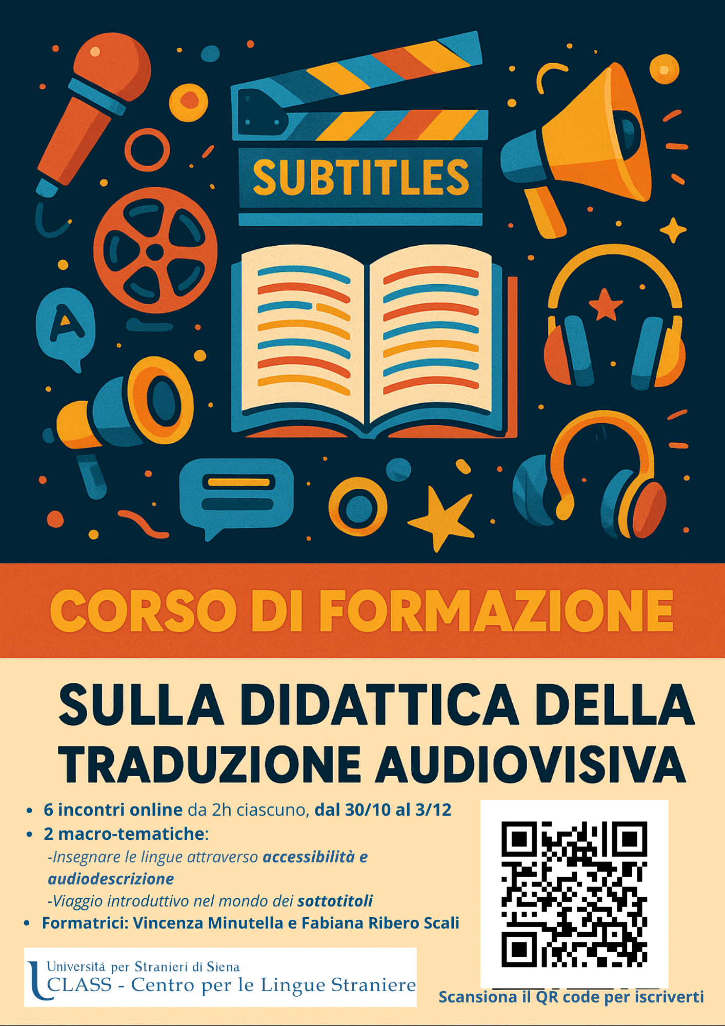 Il Centro CLASS, in collaborazione con il DISU, propone un percorso di formazione online dedicato a docenti, CEL e studentesse/studenti dei corsi di laurea magistrale interessate/i ad approfondire strumenti, metodi e pratiche legate alla didattica della traduzione audiovisiva.
