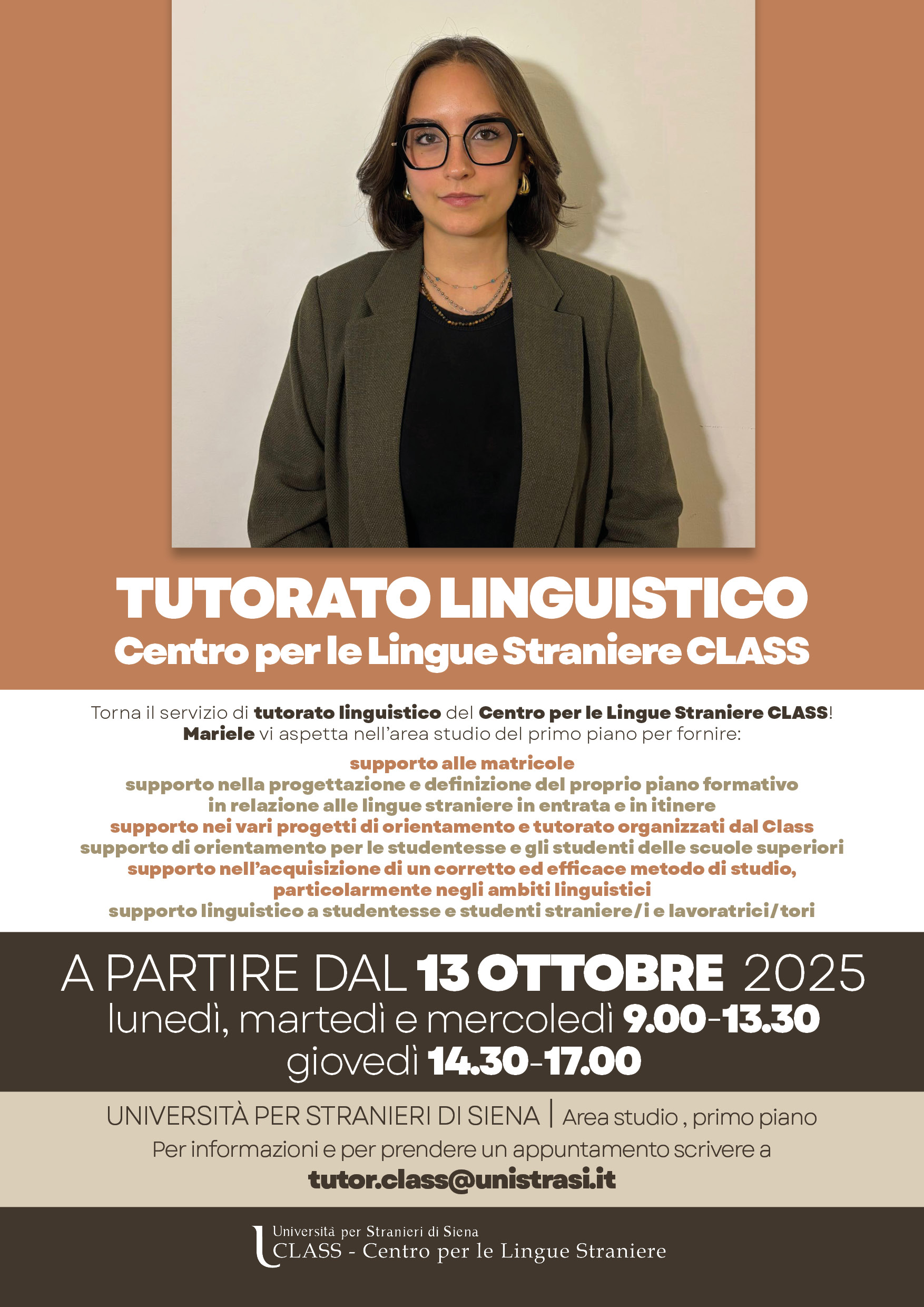 Il tutorato linguistico ricomincia lunedì 13 ottobre 2025 e si svolge ogni lunedì-martedì-mercoledì dalle ore 9:30 alle 13:30, il giovedì dalle 14;30 alle 17, primo piano area studio, piazza Carlo Rosselli 27/28.