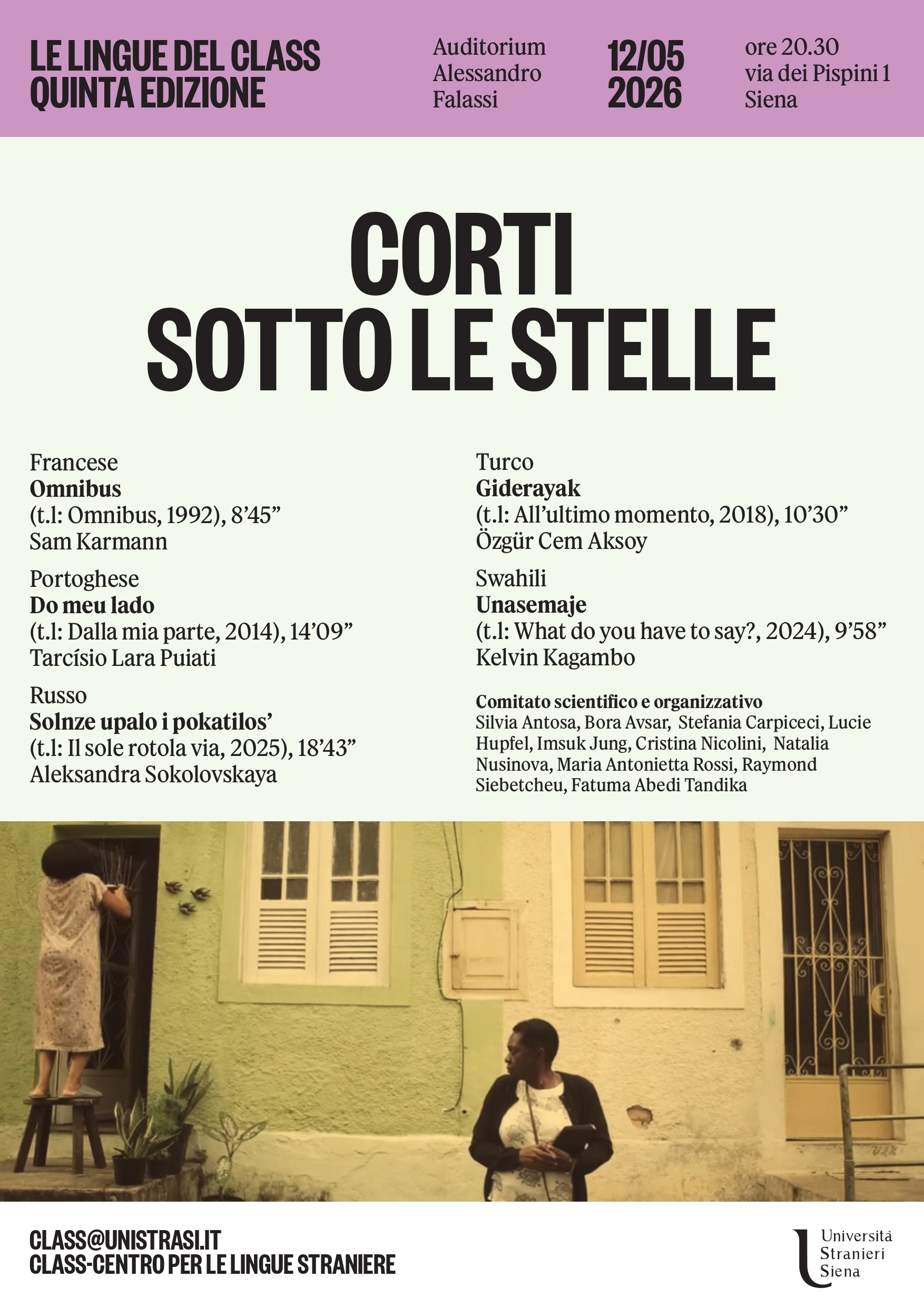 Il giorno 12 maggio 2026 alle ore 20.30 avrà luogo la quinta edizione della rassegna "Corti sotto le stelle - Le lingue del CLASS" presso l'auditorium Alessandro Falassi dell'Università per Stranieri di Siena in via Pispini 1.I corti in programma, sottotitolati in italiano e in inglese, saranno proiettati nelle lingue originali, che per l'appuntamento del 2026 sono il francesce, il portoghese, il russo, il turco e il swahili.Il Comitato scientifico e organizzativo, che per questa edizione è composto da Silvia Antosa, Bora Avsar, Stefania Carpiceci, Lucie Hupfel, Imsuk Jung, Cristina Nicolini, Natalia Nusinova, Maria Antonietta Rossi, Raymond Siebetcheu, Fatuma Abedi Tandika, augura a tutti una buona visione.LocandinaPieghevole